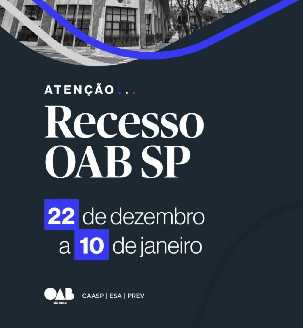 A OAB SP estará em recesso de 22 de dezembro a 10 de janeiro. Nossas atividades retornam no dia 12 de janeiro.